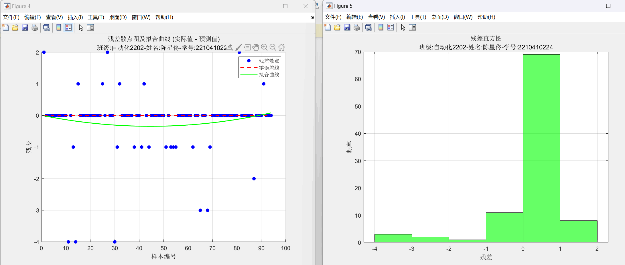 图21:重新设计的多层BP神经网络 残差散点图(含拟合曲线)和残差分布直方图